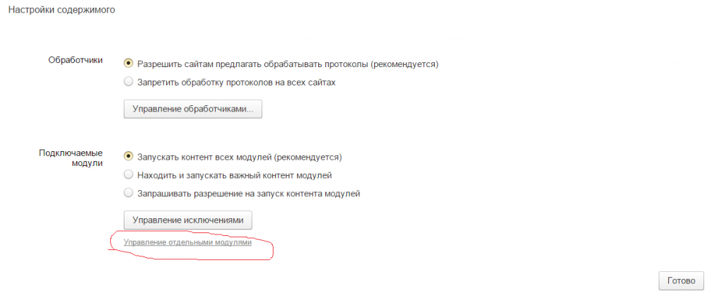 Теперь опять листаем страницу до тех пор, пока не наткнетесь на пункт "Защита личных данных". Здесь нажимаем на пункт "Настройки содержимого". Откроется окно в котором нужно нажать на подпункт "Управление отдельными модулями".