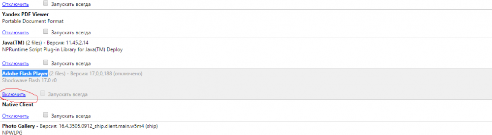 После этих действий откроется окно, которое называется "Подключаемые модули". Здесь мы ищем модуль Adobe Flash Player и нажимаем на кнопку "Включить", которая расположена под ним.