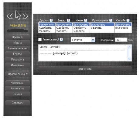 • Автоматизация. Программа VKbot способна в автоматическом режиме менять ваш статус по заданным ранее параметрам, принимать или удалять приглашения, отметки на фото и видео;