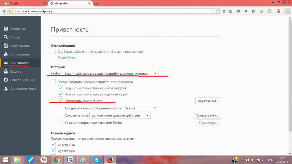 В открывшемся окне перейдите во вкладку "Приватность". В строке истории выбираем пункт "будет использовать ваши настройки хранения истории". Затем нужно поставить напротив пункта "Принимать куки с сайтов".
