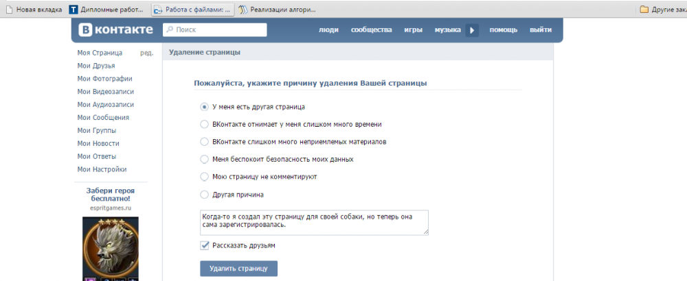 Сделав это, откроется еще одна страница, в которой вам необходимо указать причину вашего удаления. Также на этом этапе можно отметить пункт "Рассказать друзьям". После выбора причины нужно нажать на кнопку "Удалить страницу".