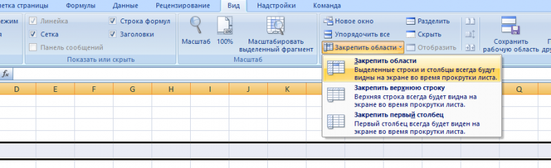 Если же вам необходимо закрепить не первую строку, а какую-нибудь другую, то нужно поступить следующим образом. Этот способ будет работать также если необходимо закрепить несколько строк. Выделяйте нужную вам строку и опять переходите во вкладку "Вид". Здесь по-прежнему выбирайте "Закрепить области" и в открывшемся окне нужно выбрать пункт с таким же названием, а именно "Закрепить области".