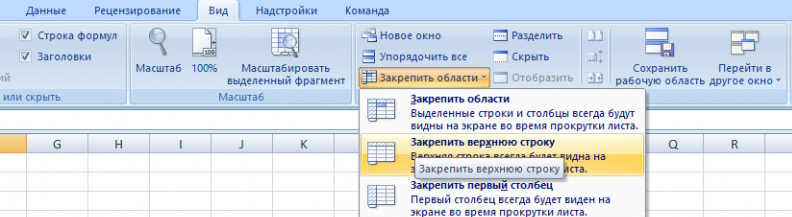 Итак, открывайте предварительно созданную таблицу и переходите во вкладку "Вид". Далее ищите и нажимайте на пункт "Закрепить области". И в открывшемся окне выбирайте пункт "Закрепить верхнюю строку".