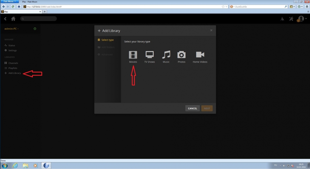 В левом верхнем углу окна будет указано имя вашего компьютера. В этом же меню вы можете увидеть значок плюса. На него нужно нажать, и после этого вы попадете в окно добавления контента в библиотеку. В первую очередь лучше добавить только фильмы. Выбрав фильмы, в первом пункте выбираем название раздела. Здесь же выбираем язык раздела.