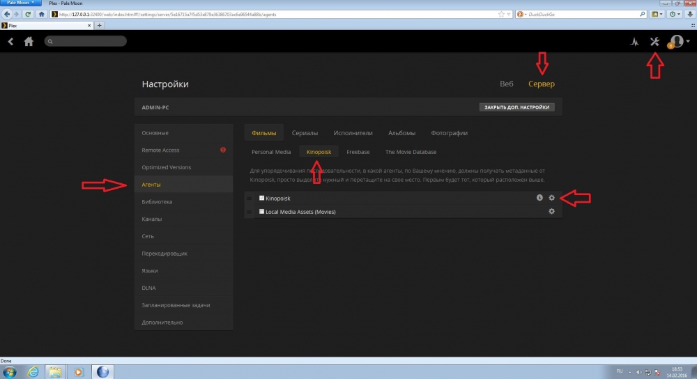 Для большей функциональности в конце статьи будет ссылка на агент Кинопоиска, который нужно скачать и закинуть в C:\Users\%Users%\AppData\Local\Plex Media Server\Plug-ins. Это даст то, что вся информация об актуальных фильмах, сериалах и подобного контента будет идти с Кинопоиска.