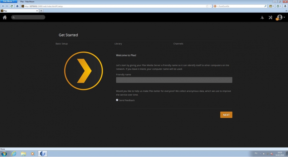 Далее открываем любой браузер и переходим по адресу 127.0.0.1:32400/web. Это веб-интерфейс сервера Plex и пока он пустой. Ставим галочки согласия с условиями и нажимаем на кнопку "Next".