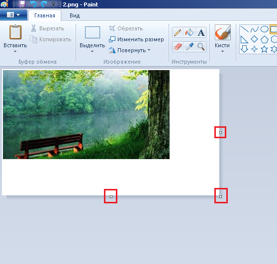 - После этих действий картинка будет скопирована на холст программы Paint. Далее нужно обрезать ненужную область, которая выходит за рамки изображения. Для этого кликните левой кнопкой мыши по этой области, после чего зажатием этой же кнопки по одному из квадратных значков перетягивайте края, пока не добьетесь необходимого результата.