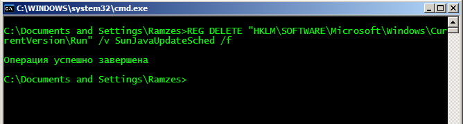 - В открывшейся консоли пропиши те следующую команду: REG DELETE "HKLM\SOFTWARE\Microsoft\Windows\CurrentVersion\Run" /v SunJavaUpdateSched /f