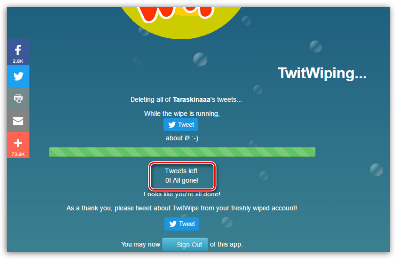 - Начнется процесс очистки, длительность которого будет зависеть, конечно, от количества твитов в вашем профиле. Как только система завершит свою работу, вы должны увидеть статус «All done». Можете пройти в свой профиль, чтобы убедиться в этом.