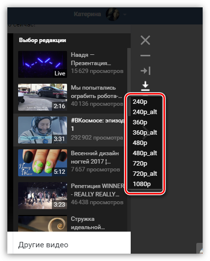 - Когда вы наведете курсор мыши на данную кнопку, всплывет дополнительное меню, в котором вам потребуется выбрать качество для загружаемого видео, например, мы хотим загрузить видео в HD-качестве, а значит, выбираем 720.