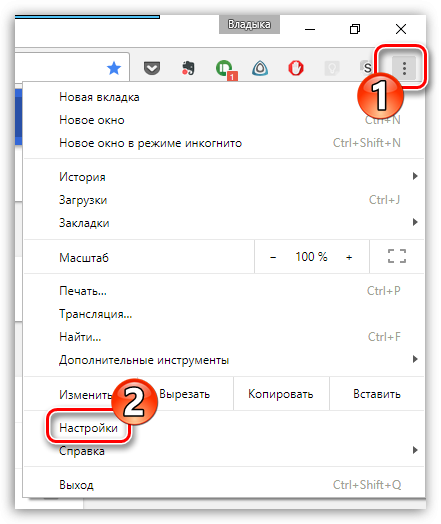 - Дли этого выполните клик в правом верхнем углу по кнопочке меню интернет-обозревателя, а затем продвигайтесь к разделу «Настройки».
