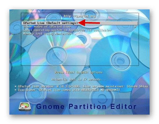 - Появится список, в котором необходимо выбрать «GParted Live (Default settings)».