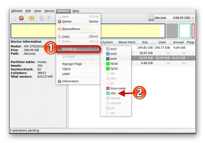 - Для того чтобы отформатировать раздел, нужно вызвать контекстное меню, а затем выбрать NTFS.