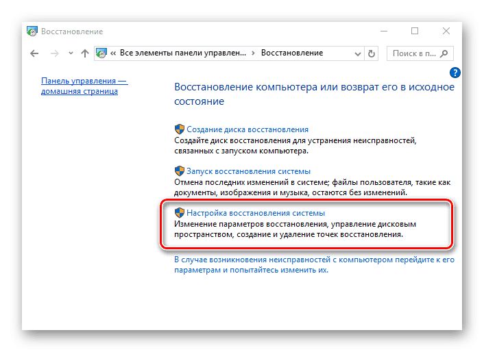 - Затем нужно нажать на иконку «Восстановление» и выбрать «Настройки восстановления системы» (необходимо авторизироваться, как администратор).