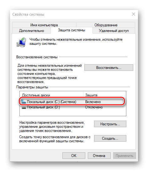 - Далее необходимо проверить защищен ли системный диск. Если его защита выключена, то необходимо её включить, кликнув на кнопку «настроить» и установив переключатель на «Включить защиту системы».