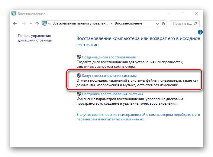 - Кликнуть на «Запуск восстановления системы» (для этого необходимо иметь права администратора).