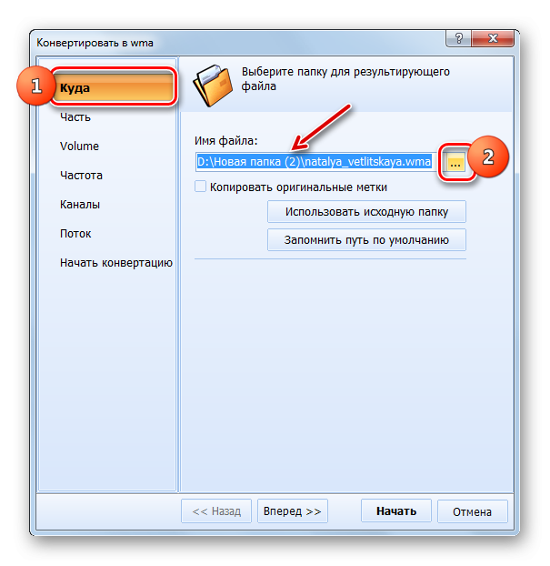 - В открывшемся окошке будут видны параметры изменения в WMA. Также есть возможность, что, переключаясь между вкладками, возможно сможете произвести настройки исходящего формата. Для самого простого конвертирования это не нужно: выберите папку, куда вы хотите сохранить файл WMА (но по умолчанию стоит папка, в которой находится исходник).