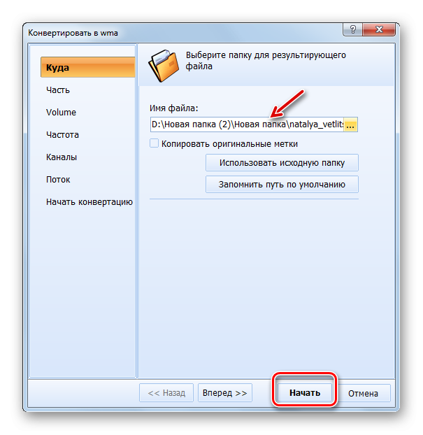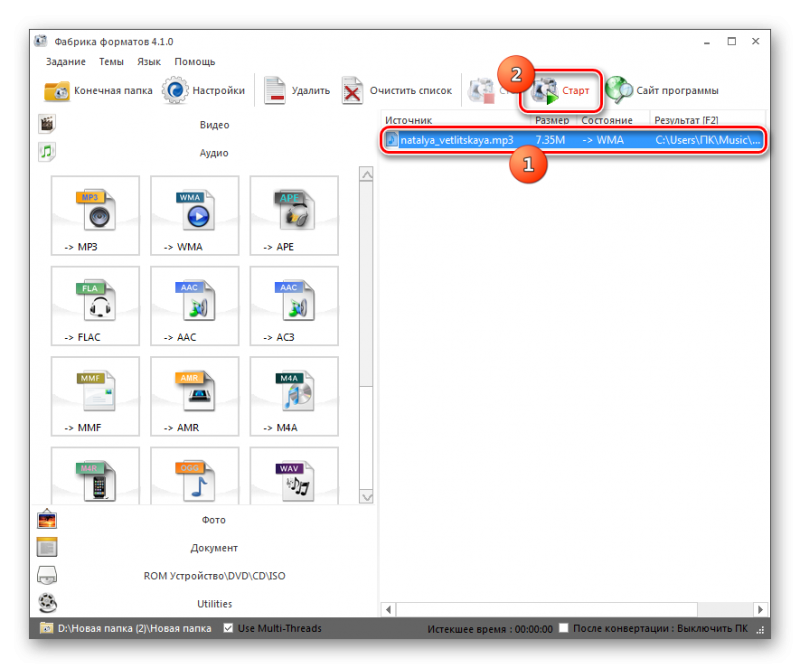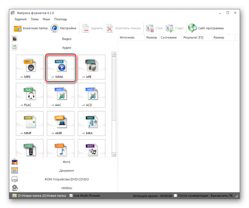 - После того как вы нажмёте на «ОК», вас вернут к самому первому окошку. Только справа отобразится задача группы WMA: будет указан исходный файл (графа «Источник»), направление конвертирования в столбике «Состояние», папка, куда будем помещён отконвертированный файл («Результат»). Чтобы запустить преобразование нажмите на «Старт».