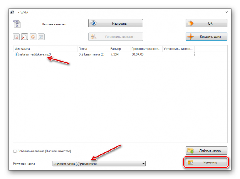 - В открывшемся окне выделите файл, который вы хотите преобразовать. Если же вам необходимо провести эту операцию с несколькими файлами, то выделяйте их все. Как было сказано выше, данная программа может работать с несколькими файлами одновременно. Затем будет открыто окно, где вы увидите все выбранные вами и уже готовые к преобразованию материалы. Также, можно увидеть, куда будет сохранён файл: «Конечная папка». Если вам необходимо поместить файл в определённую папку, то кликните «Изменить».