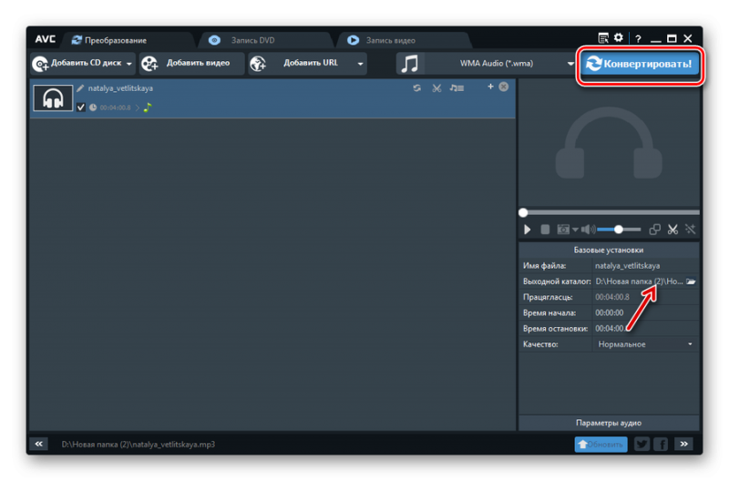 - В выпавшем списке форматов, разбитых на части, выберите «Аудиофайлы» (значок восьмой нотки). Затем найдите формат «WMA Audio». Перейдите в раздел «Базовые разработки», чтобы выбрать параметры сохранения. В папке «Выходной каталог» прописана итоговая папка. Если вам нужно сохранить файл в другую папку, крикните на значок в образе каталога. После изменения итоговой папки, вы можете нажать на значок «Конвертировать!».