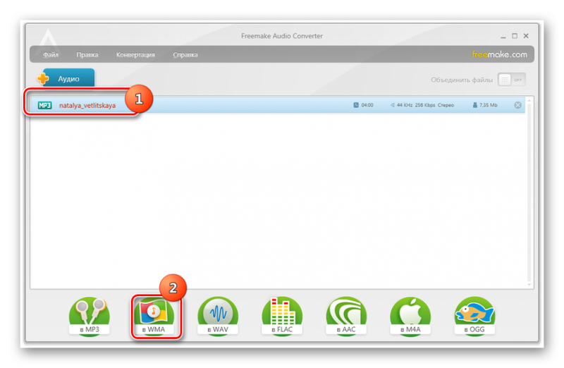 - На данном этапе необходимо указать желаемый формат аудиофайла. Для этого сначала выделите файл, а затем укажите направление переформатирования. Кликните на значок «WMA» внизу экрана.