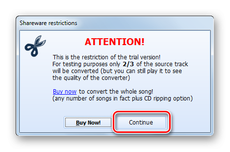 - Если вы используете бесплатную версию утилиты, то на пять секунд выскочит объявление о том, что будет конвертирован только отрывок файла. Кликните на «Continue».