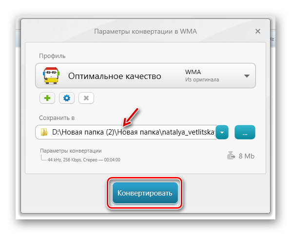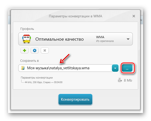 - Откроется окно «Параметры конвертации WMA». Изменять что-либо совсем не обязательно; по желанию вы можете поменять качество итогового файла во вкладке «Профиль». В поле «Сохранить в» вы увидите адрес папки, куда будет сохранён файл. Чтобы изменить папку, кликните на троеточие справа от поля.