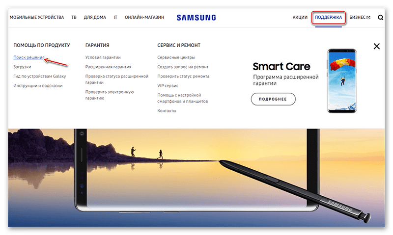 - Войдите в браузер и откройте официальный сайт Samsung. В правом верхнем меню вы найдёте интерактивную вкладку «Поддержка». Переведите на неё мышку.