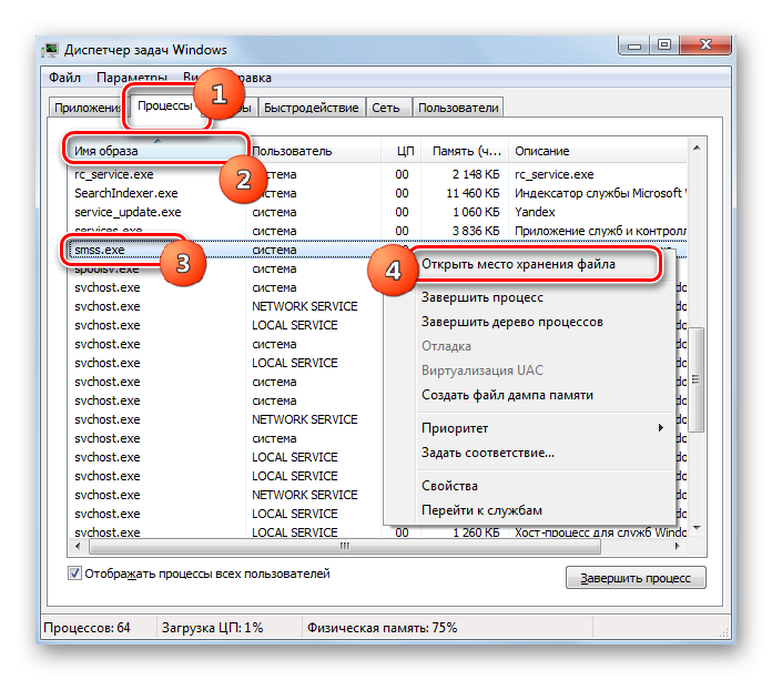 - Щёлкаем ПКМ на SMSS.EXE и выбираем «Открыть место хранения файла».
