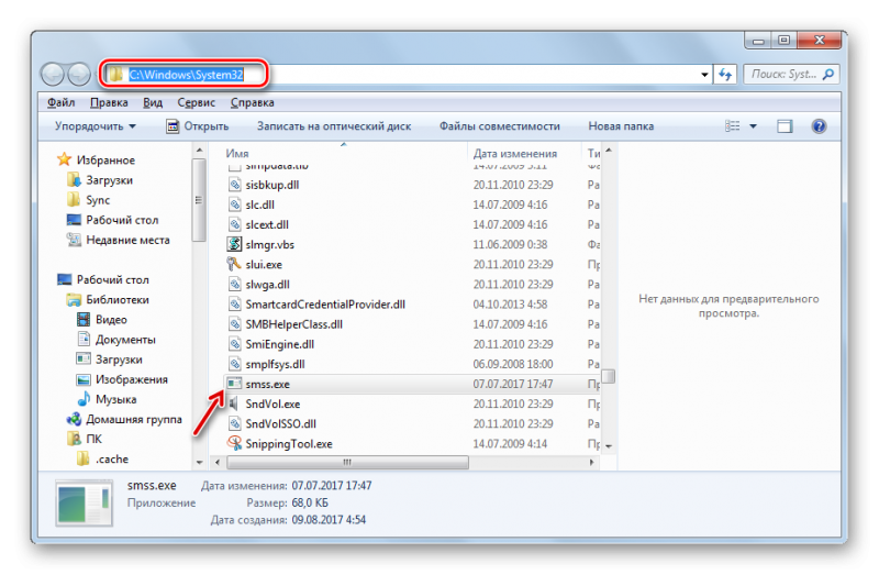 - Открылся «Проводник» в том самом месте, где располагается искомый процесс. Смотрим в адресную строку и узнаем путь: C:\Windows\System32