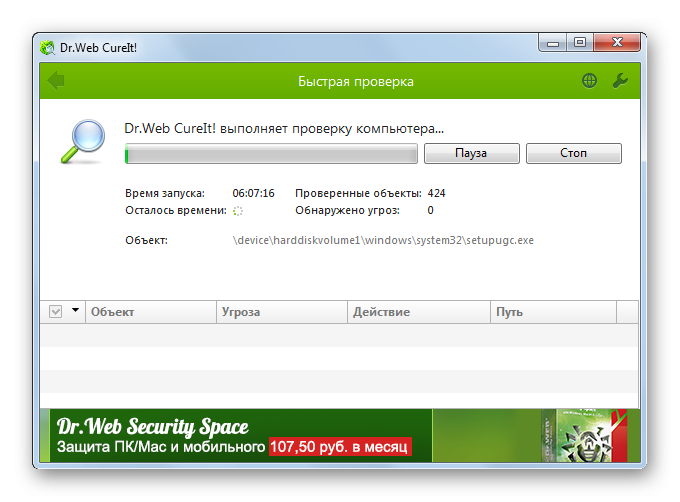 - Для начала необходимо произвести сканирование компьютера каким-нибудь антивирусом. Лучше всего использовать ту антивирусную утилиту, которая не установлена на компьютере, так как имеющаяся уже, скорее всего, пропустила вредоносные файлы и не сможет их устранить. Если программа найдет вирусы, то их необходимо удалить, используя подсказки интерфейса.