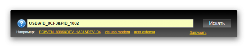 - В поисковую строку вводим «USB\VID_0CF3&PID_1002» и жмем «Искать».