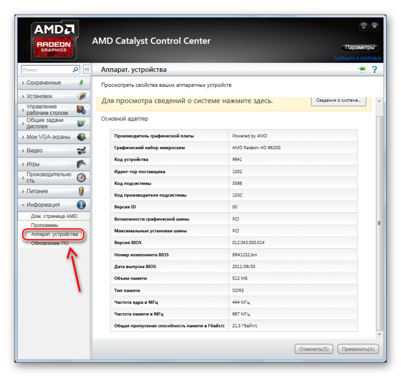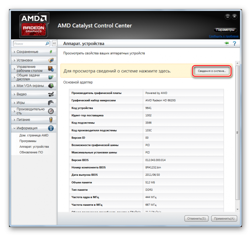 Если на компьютере установлена программа AMD CCC, можно получить информацию об аппаратном устройстве, включая частоту памяти и ядра, а также расширенные сведения о системе.