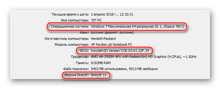 В этом меню можно узнать данные о версии DirectX и другие параметры, например номер сборки операционной системы и модель BIOS.