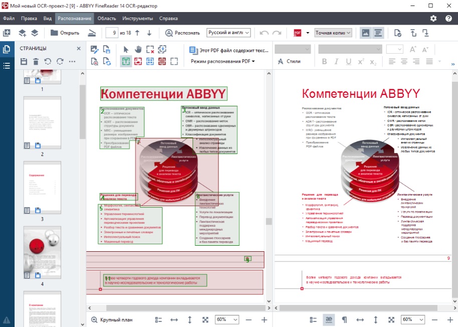 Основной особенностью программы является распознание даже из снимков низкого качества и полноценное воссоздание документов. Это означает, что FineReader позволяет воссоздавать не только текст, но и таблицы, картинки и их расположение, а также номера страниц. При этом после проведения сканирования пользователь может вручную проверить текст, и внести исправления в места, где программа могла сделать ошибку.