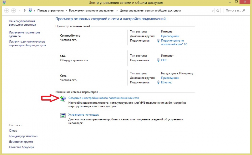 В следующем окне выбираем «Создание и настройка нового подключения или сети».