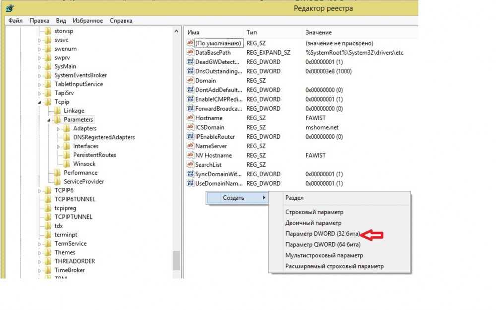 Дальше в дереве слева последовательно продвигаемся по пути HKEY_LOCAL_MACHINE\SYSTEM\CurrentControlSet\Services\Tcpip\Parameters