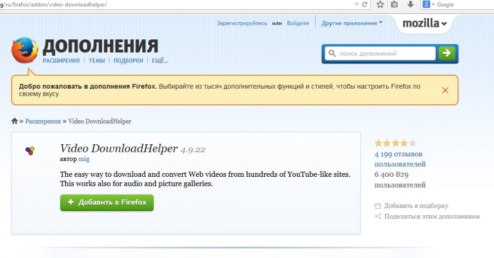- Для этого необходимо перейти на официальный сайт https://addons.mozilla.org/ru/firefox/addon/video-downloadhelper/ в Мозиле Файрфокс