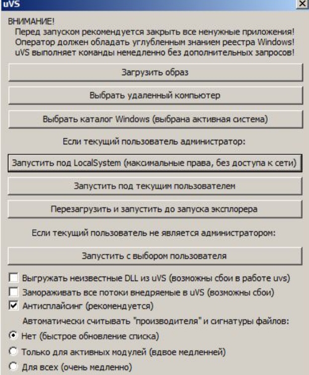 Если в безопасном режиме с командной строкой вирус все же запускается, то нам потребуется lifecd или lifeusb. Запустить windows и также воспользоваться программой universal virus sniffer. Но при этом имеется небольшой нюанс. При запуске программы нам нужно будет выбрать каталог с windows (3 кнопка сверху).