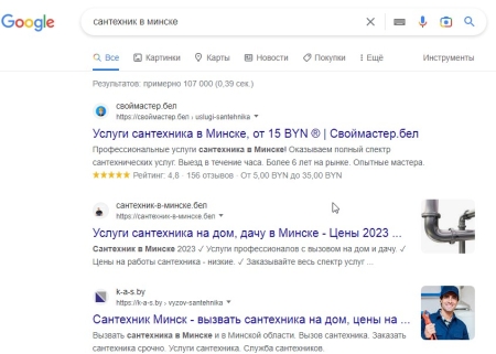 Рассмотрение: клиент осознает свою проблему и начинает искать решения, которые наилучшим образом удовлетворят его потребности. Он может начать использовать ключевые слова, включающие местоположение, характеристики продукта или тип продукта. Например, "сантехник в Минске".