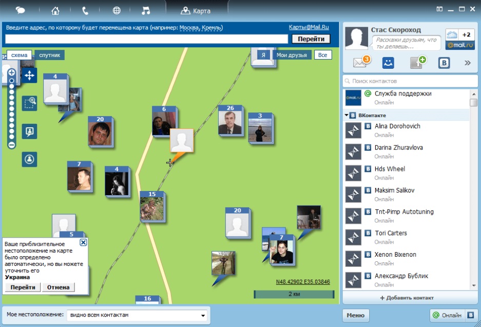 В Агенте очень хороший поиск, способный искать по следующим параметрам: по имени, фамилии, полу, возрасту, псевдониму, учебному заведению, по общим друзьям, по электронной почте, стране, региону, городу, дню рождению, по статусу (онлайн или офлайн), и даже по местоположению на карте или по наличии веб-камеры.