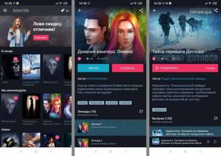 Большое количество категорий. Вы сможете найти такие темы как детективные, страшные, мистические, фантастические, философские, психологические, драматические и романтические истории. Все представлено в своеобразном формате. Внутри программы вы сможете найти рекомендации и актуальные произведения подборки и что-то новое. Самые новые появляются во вкладке на видном месте.