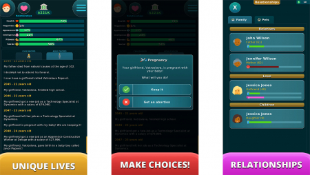 AltLife - Life Simulator предлагает широкий спектр возможностей, которые влияют на различные аспекты жизни вашего персонажа. Вы можете выбирать между различными профессиями, образовательными учреждениями, участвовать в отношениях, иметь детей и многое другое. Ваши решения определяют ваш путь и судьбу.