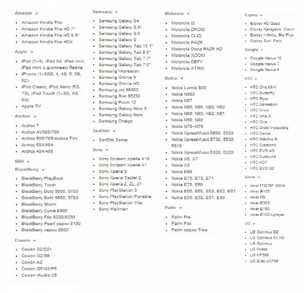 - Возможность использования готовых шаблонов настройки конвертации для устройств, перечень которых приведен в скриншоте ниже.