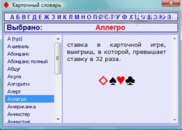 8 колод, 36|52 карты, выбор рубашки большой ряд функций справки и горячие клавиши а также три дополнительных программы (афоризмы, карточный словарь, часы).