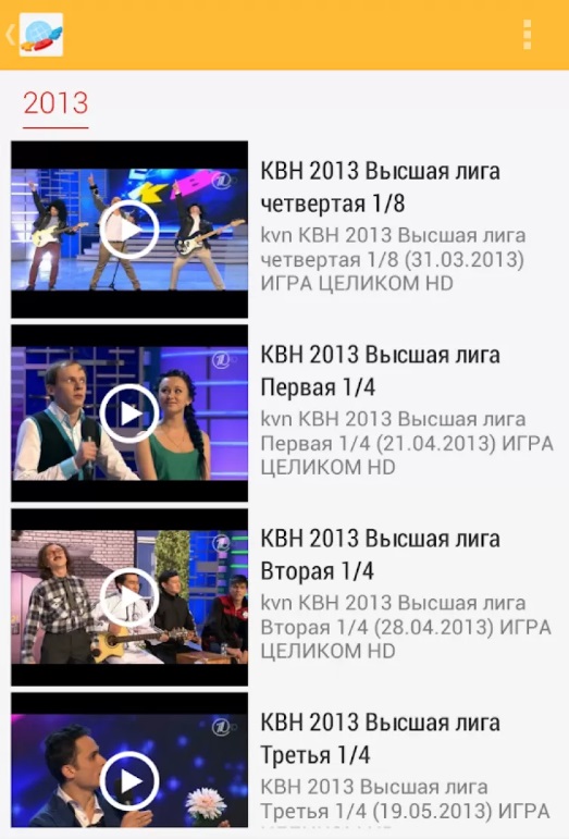 Программа предлагает пользователям просматривать КВН все игры в отличном качестве на мобильном телефоне или планшете. Присутствует много категорий для быстрой и комфортной навигации по приложению.