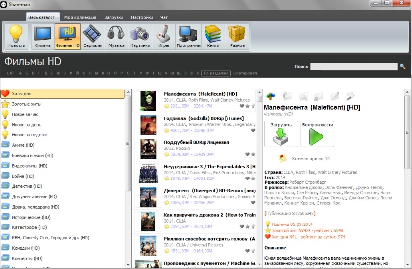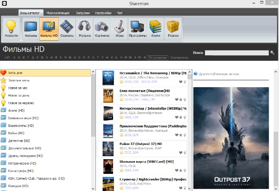 Бесплатная программа в которой сможете смотреть менеджер загрузок каталог файлов файлообменные клиенты и наличие чата. Всё разделено на восемь тематических разделов, допустим музыка и игры сериалы мультфильмы и так далее. До всего материала есть описание, где вы сможете увидеть рейтинг. Ищите быстро по поиску каталога в котором можно настроить сортировку по дате и названию.