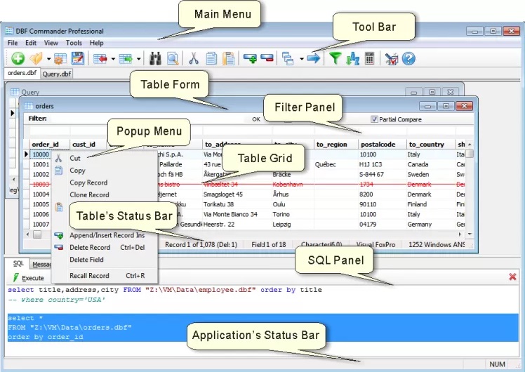 Программа предлагает пользователям в работе с файлами dbf. Создавайте и открывайте новые файлы в формате dbf редактируйте копируйте и отправляйте на печать с запросами SQL.