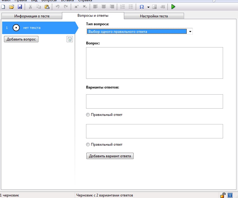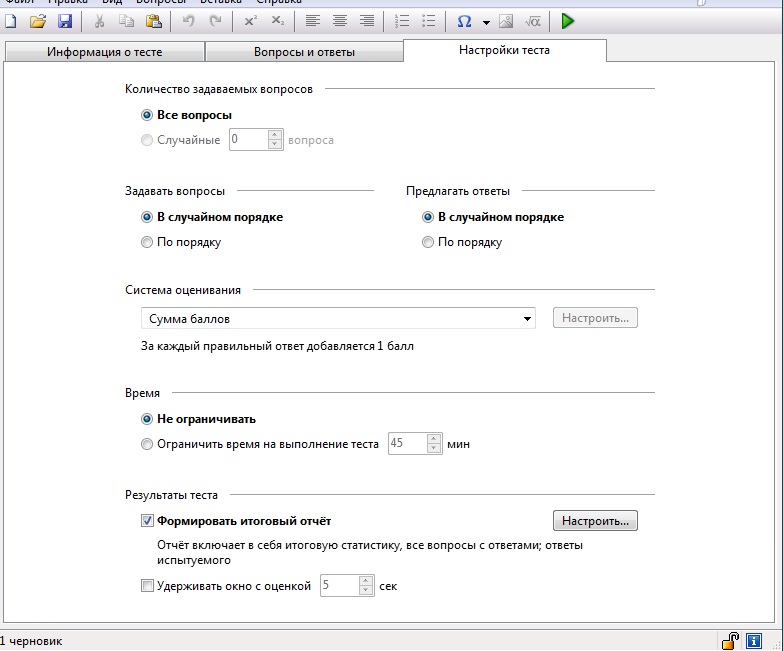 Вы сможете пополнять в тест вопросы различных видов: с одним правильным ответом, с пару верными ответами и с одним вводом ответа. Вопросы могут составлять в себе графические файлы специальные символы и формулы. Помимо этого тест можно настроить с демонстрацией подробной статистики о прохождении теста в конце а также добавить время при котором закончится тестирование.