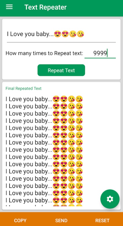 Вы сможете повторять сообщения многое количество раз и развлекаться. Предлагает вариант повтора когда это необходимо. Вы сможете отсылать много смайликов и форматирования. Создавать свой текст сообщения и развлекаться с друзьями и временно. Понравится всем девушкам и мальчиком. Много функций встроено в приложение.